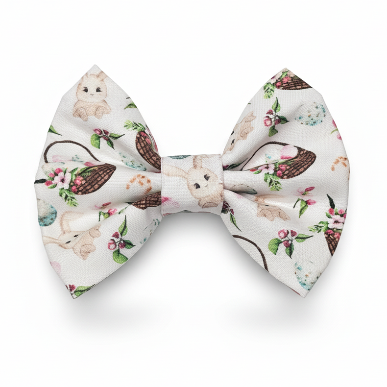 Celebrate the season with our adorable Spring Bunny Bow! This charming accessory features a delightful pattern of sweet bunnies, pastel flowers, and spring blooms on a soft white background.